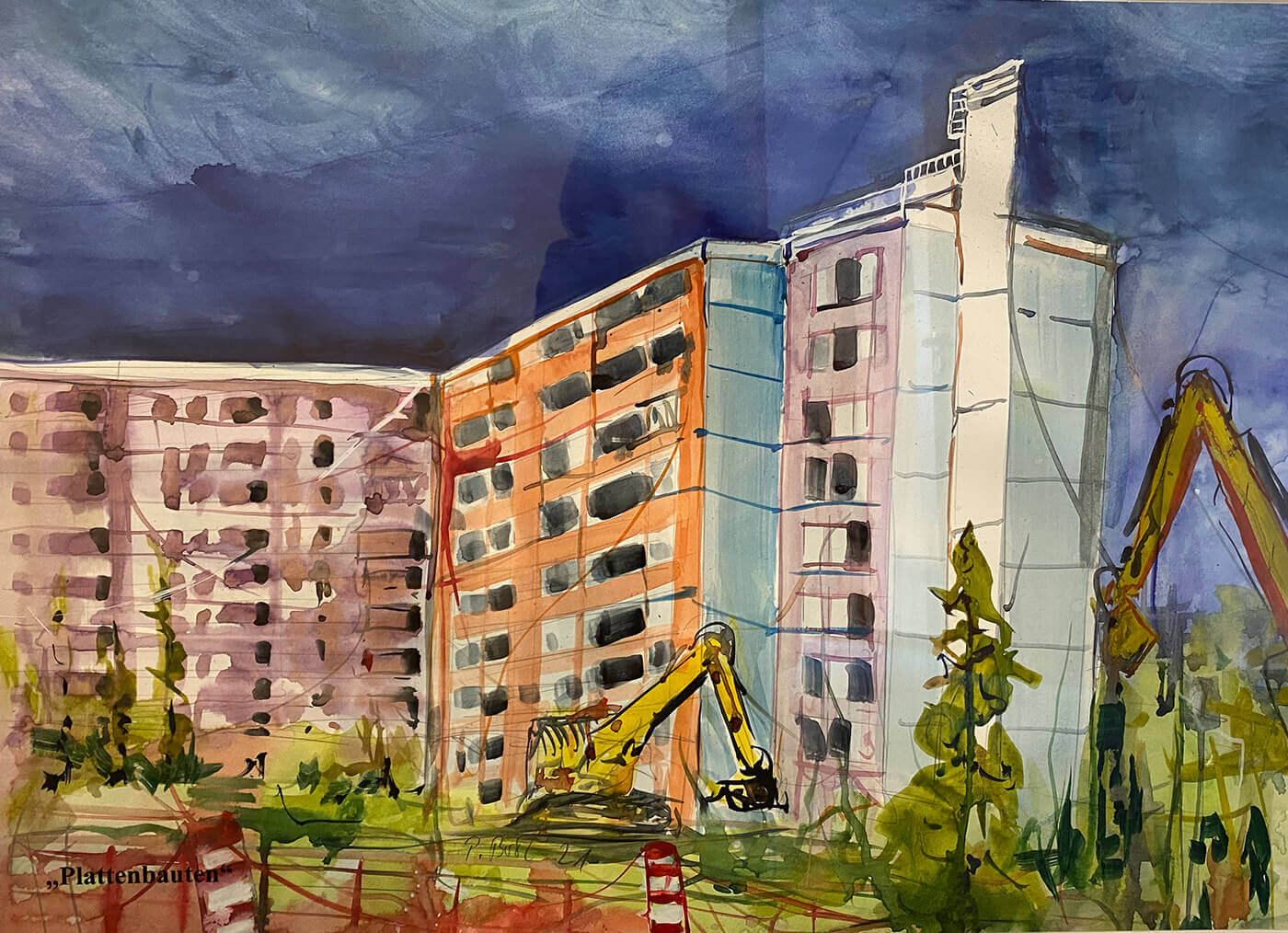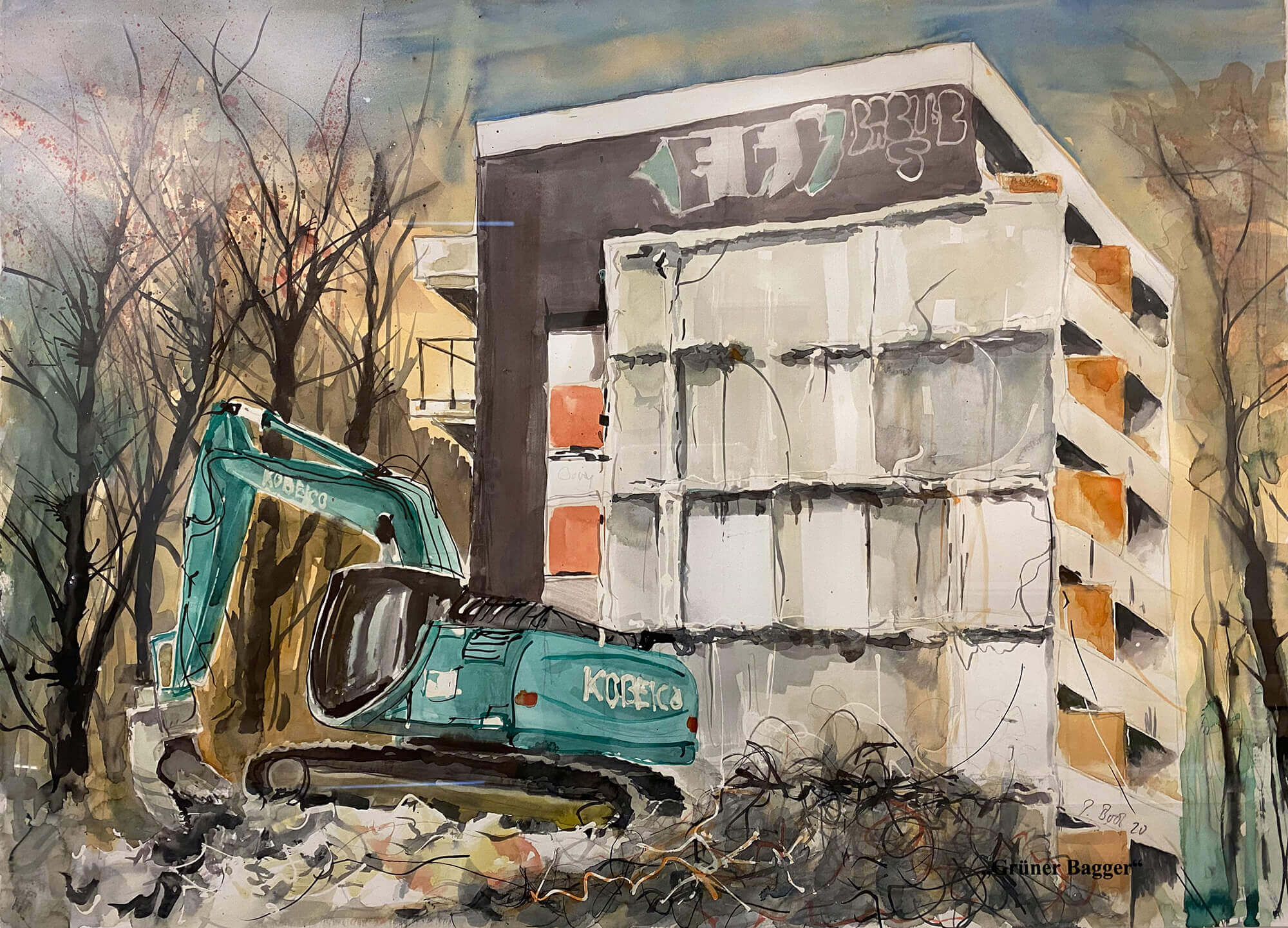 Zum Abschluss seiner Aquarell-Ausstellung gibt der gebürtige Delmenhorster Peter Bock einen Einblick in einen ganz neuen Bilder-Zyklus. Wie ein Stadtchronist wird er über mehrere Jahre die Veränderungen im Stadtteil Wollepark dokumentieren: Leerstand, Demontage, Tristesse — aber auch Aufbruch und soziale Projekte. Er schafft mit leichtem Pinsel eine ungewöhnliche Motivserie abseits des Pittoresken und bietet damit eine interessante Diskussionsgrundlage für alle, denen die Entwicklung unserer Stadt am Herzen liegt.